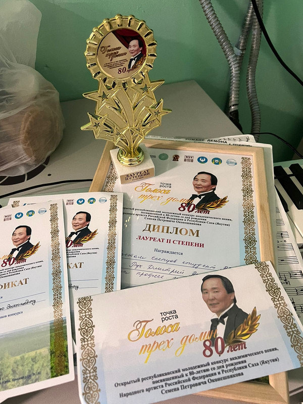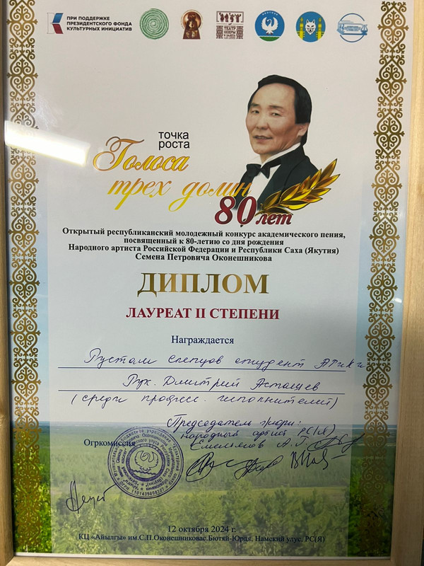 Поздравляем руководителя кружка ЦКиСИ им. Ю.А. Гагарина Рустама Михайловича Слепцова с заслуженной наградой – дипломом лауреата 2 степени первого республиканского вокального конкурса академического пения «Голоса трех долин», посвященного памяти народного артиста РФ и народного артиста РС (Я) С.П. Оконешникова! Желаем дальнейших творческих успехов и достижений!